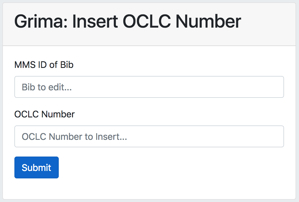 After the OCLC number has been successfully inserted into the specified record, the newly edited record is displayed using the PrintBib grima so that the user can confirmed that it worked correctly.